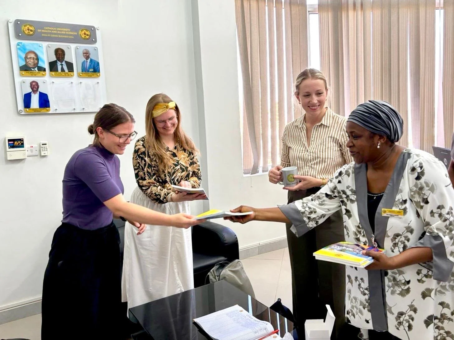 On Friday morning, we had the pleasure of meeting three CUHAS staff who have been instrumental in supporting the Kolabo partnership. New faces include, from left to right: Professor Peter Rambau, Deputy Vice Chancellor of Academic Research and Consultancy; Professor Mariam Mirambo, Associated Dean of CUHAS School of Medicine; and Dr. Dismas Matovelo, Associated Director of Postgraduate Studies. We spoke about the progress made thus far towards developing the “Masters of Medicine in Psychiatry” program at CUHAS. We were excited to hear about the Tanzanian governments’ emphasis on mental health funding in recent years, highlighted during the government’s event: “There is no health, without mental health!,” to commemorate World Mental Health Day on October 10, 2022. We were able to discuss how the University of Calgary team may be able to support the process as we continue to collaborate in the coming years. Finally, we had an opportunity to sign the visitor’s log of Vice Chancellor Professor Erasmus Kamugisha, where Professor Mariam Mirambo offered us treasured gifts on behalf of CUHAS.